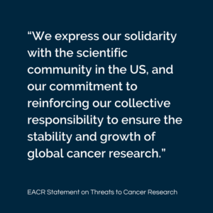 The European Association for Cancer Research (EACR) recognises the profound challenges our friends and colleagues in the United States are facing due to disruptions to their research funding and infrastructure. These actions threaten not only the progress of cancer research in the US but also the vital contributions of US-based researchers to the global effort against cancer. We stand in full support of our colleagues in the United States and endorse the American Association for Cancer Research (AACR) statement regarding the US administration’s recent actions.