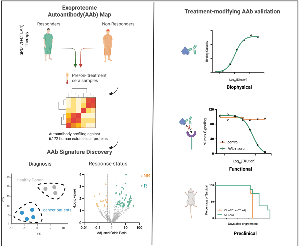 These findings open several promising directions. Because AAbs effectively act as naturally occurring biologic drugs, the targets they highlight can serve as a shortlist for therapeutic development or drug repurposing. For instance, existing agents like anifrolumab (an IFNAR-blocking antibody approved for lupus) could be explored in combination with CPIs. Conversely, AAbs that impair treatment point to pathways that should be preserved or enhanced, such as BMP receptor signaling. More broadly, the “autoantibody-wide association study” framework introduced here could be applied across diseases to uncover functional roles of humoral autoreactivity, much as genome-wide association studies have done for genetic variation. Larger cohorts and prospective clinical trials will be needed to confirm causal relationships and translate these findings into improved patient stratification and combination treatment strategies.