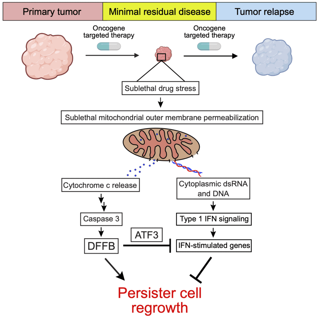 Acquired resistance to oncogene-targeted therapy contributes to cancer patient mortality. During treatment, cancer persister cells reversibly enter a quiescent state, tolerate drug stress, undergo adaptations and seed tumor regrowth. There is limited understanding of the adaptive mechanisms utilized by persister cells to escape growth arrest. To address this, Williams et al. discovered that due to sublethal apoptotic drug stress, persister cells generate type I IFN which enforces their growth arrest. However, persister cells also activate the apoptotic DNA endonuclease DFFB (also known as CAD) as a result of sublethal apoptotic caspase activity. While DFFB is normally responsible for fragmenting chromosomal DNA during apoptotic cell death, in surviving persister cells it instead induces nonlethal DNA damage, mutagenesis, and promotes expression of stress response factor ATF3. ATF3 relieves persister cells from type I IFN-enforced growth arrest by inhibiting IFN-stimulated gene (ISG) expression. Therefore, persister cells repurpose cell death machinery to escape from IFN-enforced growth arrest. These observations point toward potential therapeutic opportunities to inhibit this IFN suppression mechanism to prevent acquired resistance to targeted therapies.
