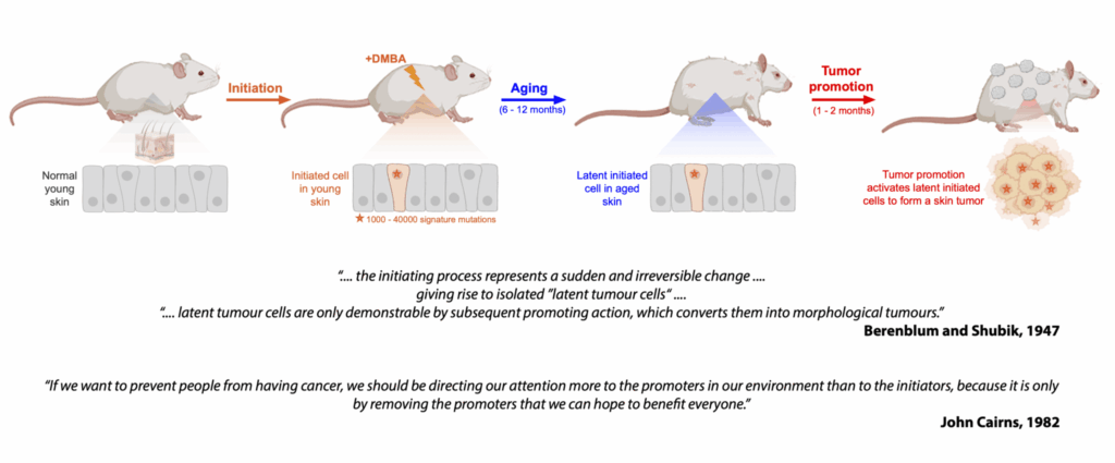 In this study by Li et al, these historical studies were replicated and extended, showing that a single treatment with a potent mutagen (in this case Dimethylbenzanthracene, or DMBA) could induce >40,000 mutations genome wide in single cells, but this high mutation burden, which included activating mutations in strong cancer driver genes such as Hras, was not sufficient for cancer development. These single mutated cells lay dormant for 6-12 months, but were activated by subsequent chronic treatment with 12-O-tetradecanoyl-phorbol-acetate (TPA), the classical tumor promoter used in the early studies. Likewise, genetic activation of Hras or Kras mutations in mouse skin transgenic models was also not sufficient for tumor development, but required tissue wounding by TPA treatment or skin wounding. Even when initiation was carried out during embryonic development, by treating pregnant mice systemically with DMBA, no tumors subsequently developed unless the skins were treated with TPA at the adult stage. These data suggest that normal cell division during development and adult tissue turnover is not sufficient for promotion, but tissue damage is required to reverse the latency and cause tumor outgrowth.