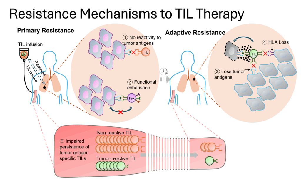 These results underscore TIL therapy’s areas for future improvement. Tumors can swiftly adapt by shedding the antigens targeted by infused T cell clones, mirroring CAR T challenges where target loss or dwindling memory-like cells drive relapse. Although TILs’ multi-specificity offers an advantage, it may need to be paired with other technology, such as a CAR-T to circumvent HLA loss. The logistical demands of TIL therapy add another barrier. It requires surgery and weeks of ex vivo expansion, during which cells may lose potency. Efficacy depends on unknown factors such as TIL reactivity, in vivo persistence, antigen retention, and matching HLA alleles. To overcome resistance, future strategies will focus on immune engineering to enhance TIL survival and on designing T cells against clonal neoantigens, a promising but currently limited approach, due to the need for identified T cell receptors. Multiplex methods to identify T cell receptors against public neoantigens may be other technology to pair with polyclonal TIL for the future.
