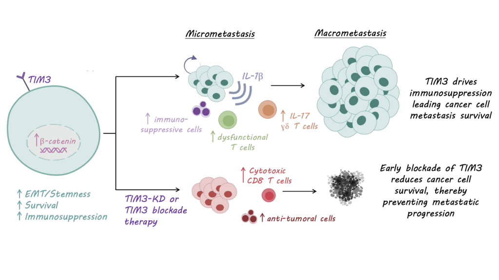 During metastasis, the interactions between the immune system and tumor cells in the micrometastatic stage remain poorly understood. Identifying vulnerabilities in these early lesions before they progress into macrometastases could open new therapeutic avenues for metastasis prevention. In this study, we describe a key role of the protein TIM3 (T cell immunoglobulin and mucin domain 3) in tumor cells during micrometastasis, using breast cancer (BC) metastasis mouse models.